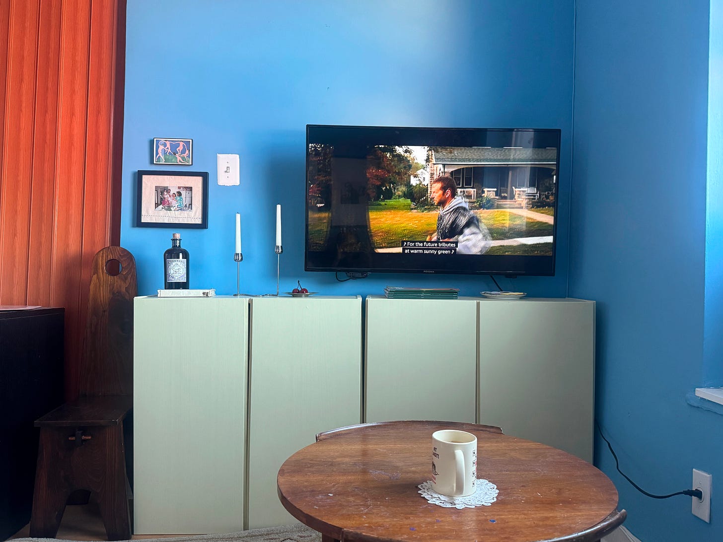 For my most recent project, I decided I needed to do something about the wall my TV is mounted on. I had saved many images on Pinterest of living rooms with gorgeous styled shelves. I also realized, I wasn’t sure what exactly I’d put on these shelves. I’m very against buying a bunch of books in bulk just to style shelves—but that’s for another newsletter. What I really needed from that space was to cover up the radiator below my TV and add storage for all my random tools/stuff.