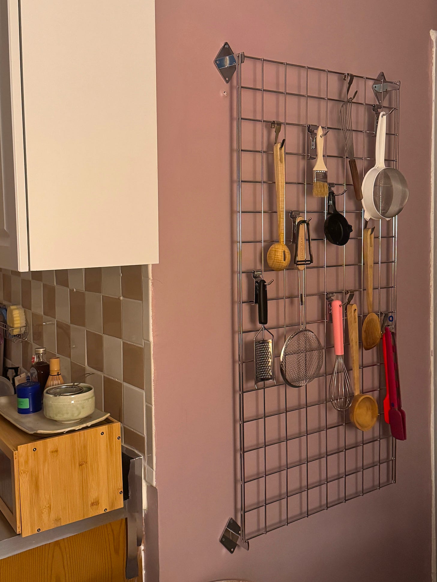So, I looked for options that could utilize the wall space opposite my stove. I’m not a fan of peg boards, and there wasn’t enough space for a shelf, or cabinet so I found this steel grid that plays off the other stainless steel elements in my kitchen.